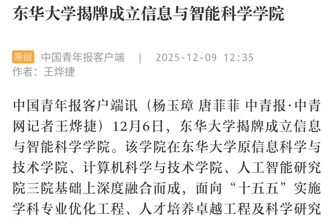 中国青年报客户端讯(杨玉璋 唐菲菲 中青报·中青网记者王烨捷)12月6日,东华大学揭牌成立信息与智能科学学院。该学院在东华大学原信息科学与技术学院、计算机科学与技术学院、人工智能研究院三院基础上深度融合而成,面向“十五五”实施学科专业优化工程、人才培养卓越工程及科学研究攀登工程等三大工程,聚焦数据与知识工程、智能与机器视觉、安全与可信计算三大前沿学科方向,全面推进培养信息与智能科学领域人才。