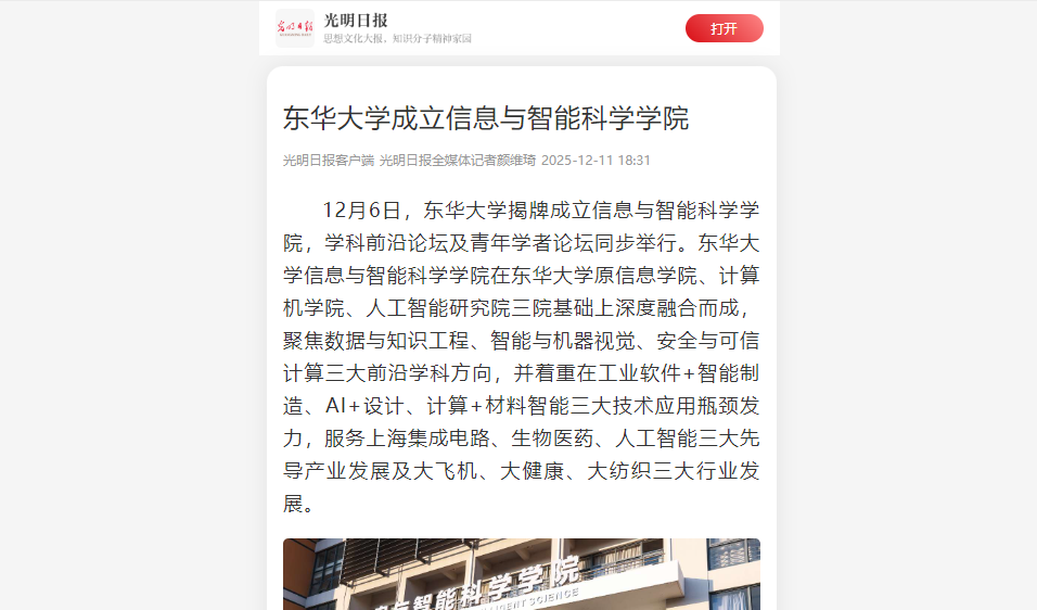 12月6日,东华大学揭牌成立信息与智能科学学院,学科前沿论坛及青年学者论坛同步举行。东华大学信息与智能科学学院在东华大学原信息学院、计算机学院、人工智能研究院三院基础上深度融合而成,聚焦数据与知识工程、智能与机器视觉、安全与可信计算三大前沿学科方向,并着重在工业软件+智能制造、AI+设计、计算+材料智能三大技术应用瓶颈发力,服务上海集成电路、生物医药、人工智能三大先导产业发展及大飞机、大健康、大纺织三大行业发展。