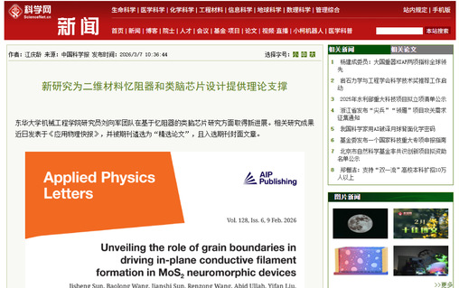 东华大学机械工程学院研究员刘向军团队在基于忆阻器的类脑芯片研究方面取得新进展。相关研究成果近日发表于《应用物理快报》,并被期刊遴选为“精选论文”,且入选期刊封面文章。
