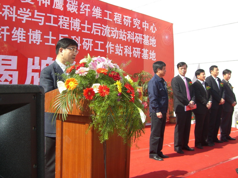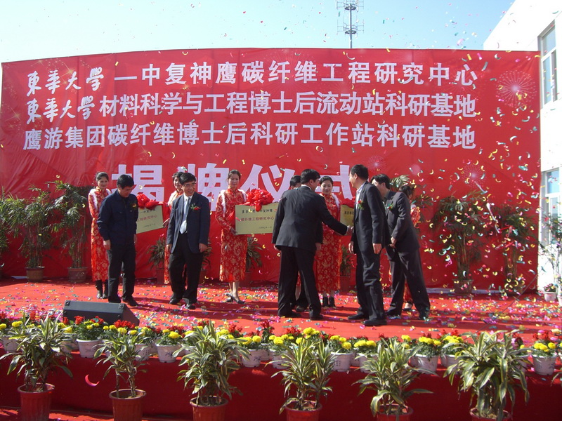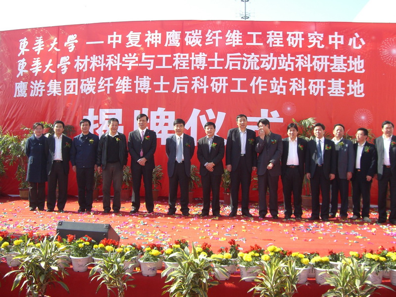 4月17日下午,东华大学-中复神鹰碳纤维工程研究中心、东华大学材料科学与工程博士后流动站科研基地、中复神鹰碳纤维有限公司博士后工作站三块牌子揭牌仪式在连云港市中复神鹰碳纤维有限公司隆重举行,出席仪式的有我校校长徐明稚、中复神鹰碳纤维有限公司董事长张国良、中国复合材料集团董事长张定金、连云港市经济技术开发区管委会副主任邱家海、我校科研处处长俞建勇、校长办公室主任徐伟、材料学院党总支书记何雅、常务副院长王华平、人事处副处长李耀刚、研究员潘鼎、吕永根等。