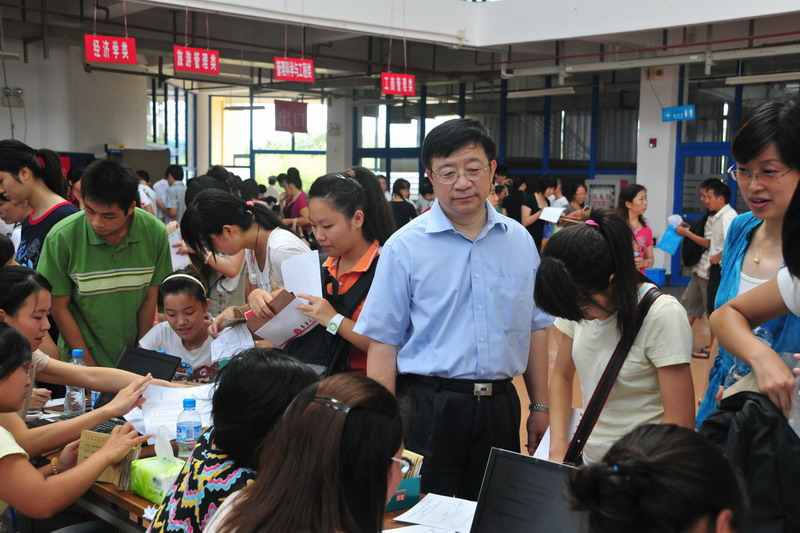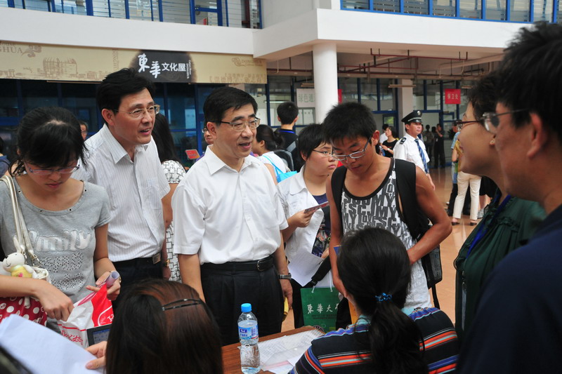 金秋九月,美丽的东华校园展开双臂,喜迎新生。8日,3800多名本科生在学生活动中心各学院的报到点排起了长长的队伍,办理入学手续。9日,2200多名研究生也踏入校园,报到注册。两天时间里,校党政领导朱绍中、徐明稚、吴楚武、浦解明、朱世根、陈田初等亲临现场,看望入学的新生,给贫困学生送上生活用品,关心学生的住宿,给刚刚踏进校园的学生以极大的关怀和鼓励。