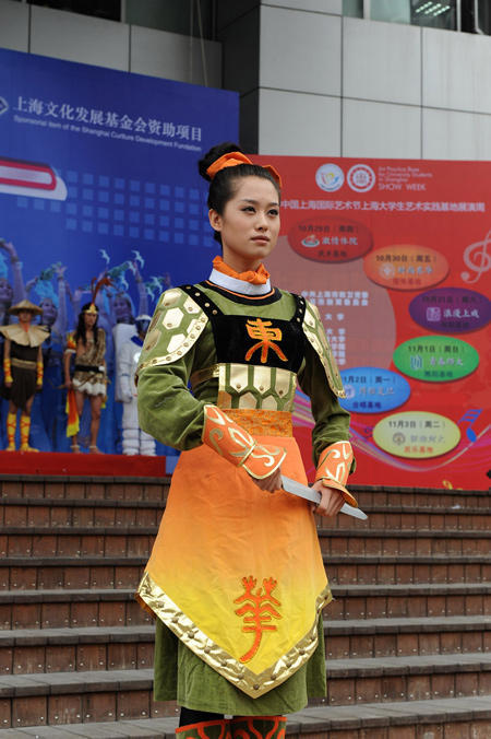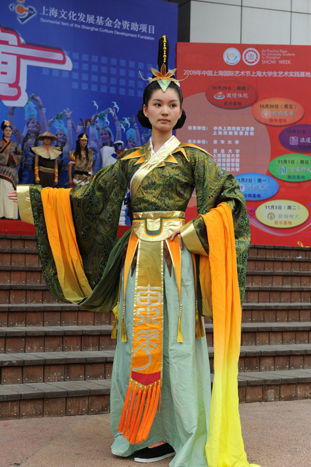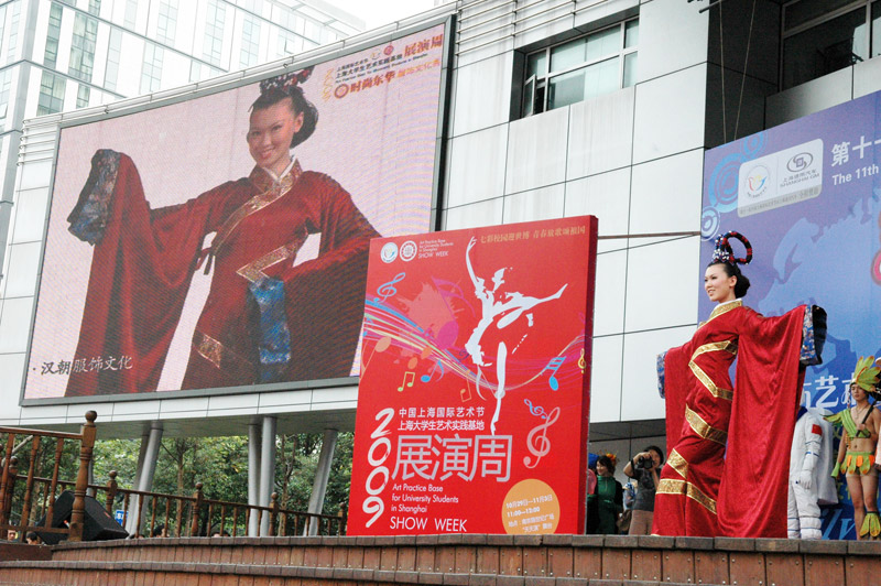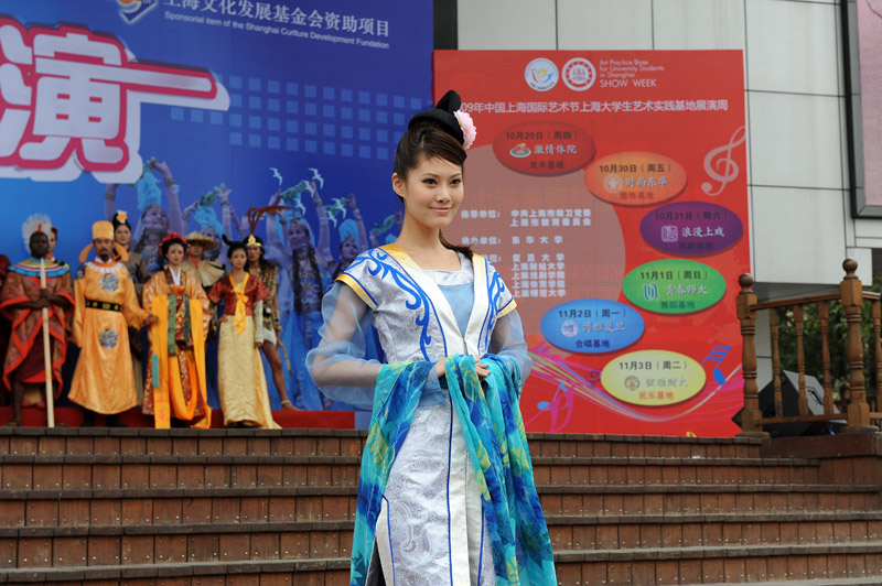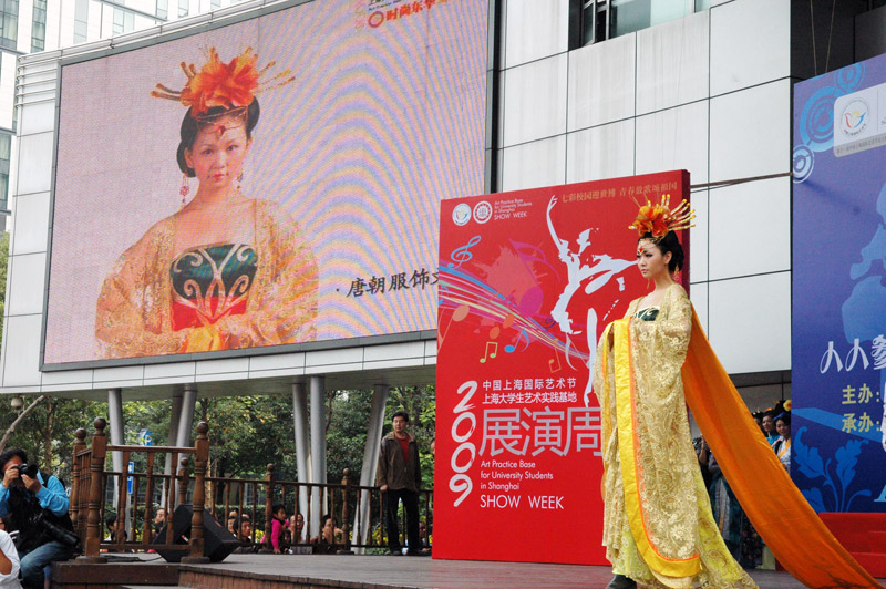 10月30日上午,2009中国上海国际艺术节上海大学生艺术实践基地展演周活动《时尚东华》东华大学服饰艺术基地专场盛装亮相南京路世纪广场“天天演”舞台,近千名群众到场观看。演出吸引了新华社、人民日报、上海电视台等多家媒体记者。上海市委宣传部副部长陈东,上海市教卫党委副书记、上海市教委副主任莫负春,上海市黄浦区副区长沈祖炜,上海国际艺术节中心总裁陈圣来,东华大学党委副书记浦解明,以及来自上海市教卫党委宣传处、上海世博局志愿者部、上海国际艺术节群文部、复旦等兄弟高校宣传部的领导、老师与各界群众共同观看了演出。
