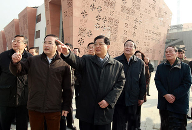 1月15日上午,胡锦涛总书记来到上海世博园区,实地考察上海世博会筹办工作情况,我校校友、上海世博会最佳实践区总负责人孙联生部长(左二)向胡锦涛详细介绍了世博会工程建设和布展工作进度。