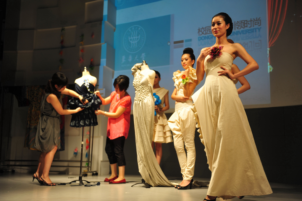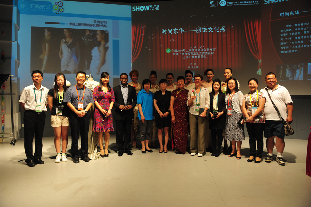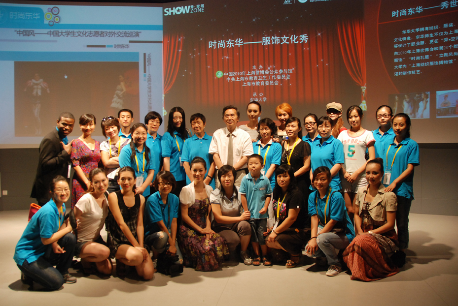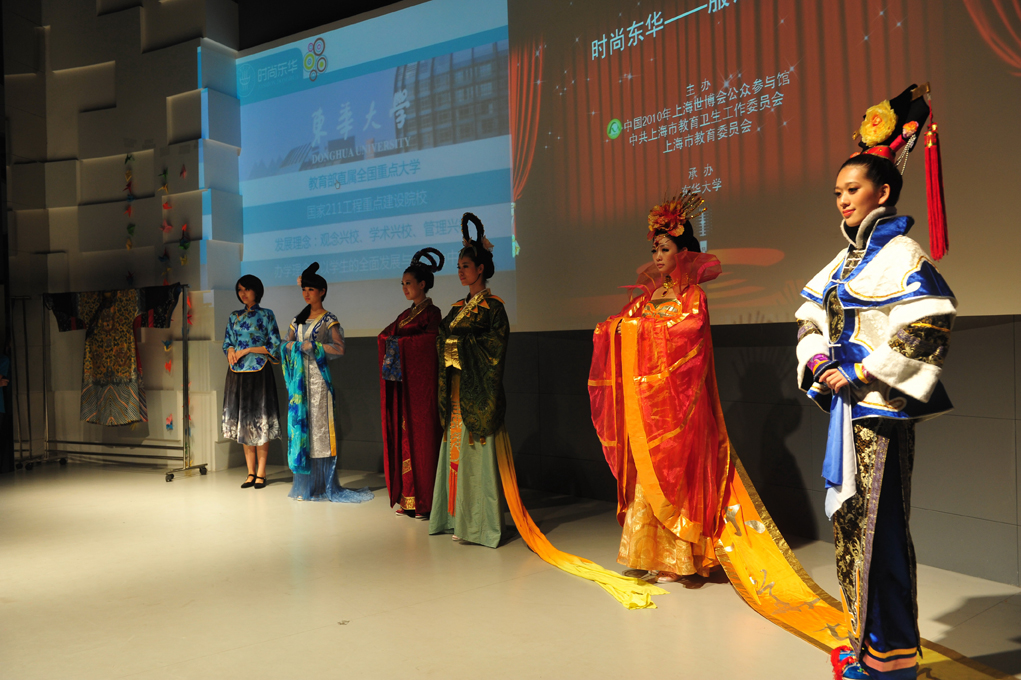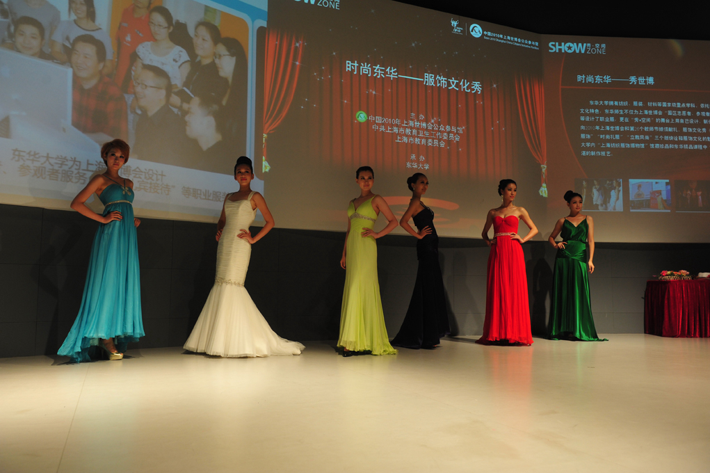 9月10日至12日,2010年上海市庆祝教师节主题系列活动——《时尚东华》专场分9场在世博园主题馆“秀•空间”舞台滚动上演。该活动由我校宣传部联合服装学院、纺织服饰博物馆等部门策划承办,20余名参演师生分“古代服饰”“时尚礼服”“立裁风尚”三个版块诠释服饰文化的魅力,并现场展示了东华大学内“上海纺织服饰博物馆”馆藏珍品和东华精品课程中“立体裁剪”与“丝网花”两项精湛的制作技艺,留学生柯森还现场演唱了《我爱你,中国》《弯弯的月亮》等歌曲。“策划用心”“很有品位”“太精彩了”“真漂亮”“对教学场景身临其境!”……精湛的表演吸引着无数观众驻足,更赢得了领导与观众的一致喝彩。国际展览局高官代表TEAERICA BUSA、世博会公众参与馆馆长尼冰、我校党委副书记浦解明等领导观看了演出,并与参演师生合影留念。