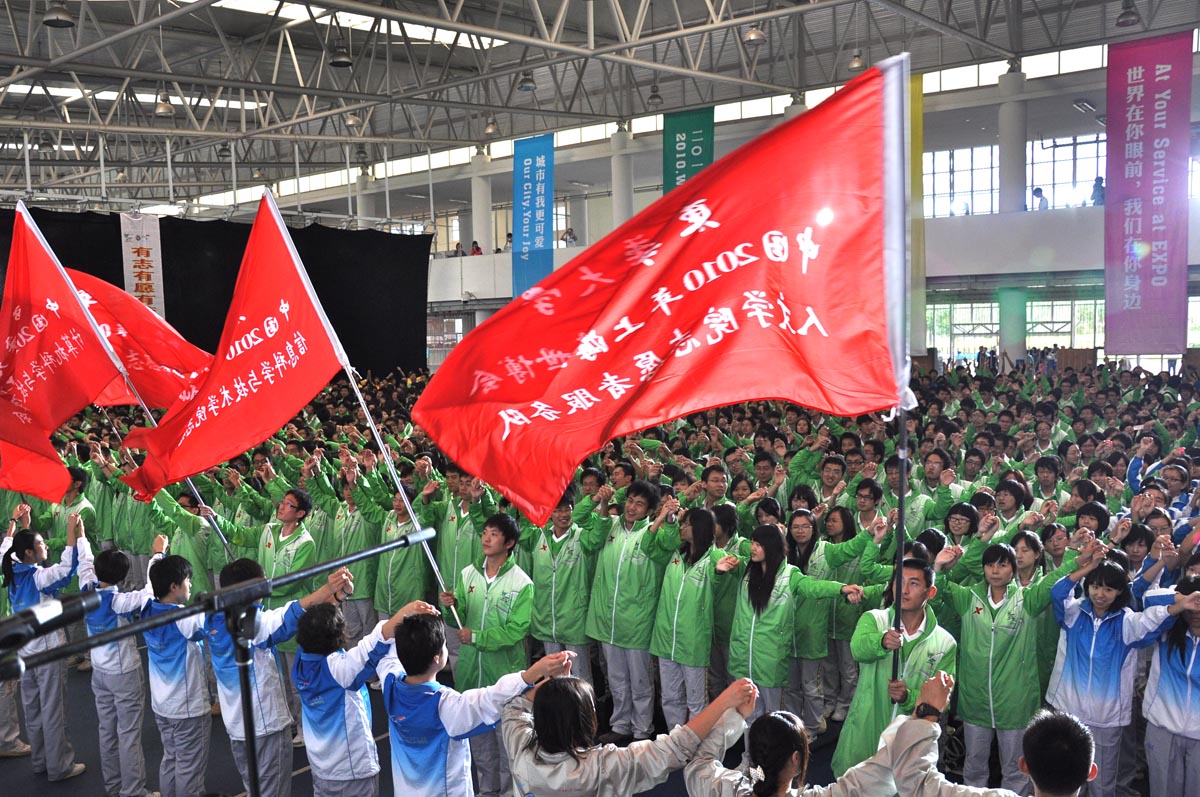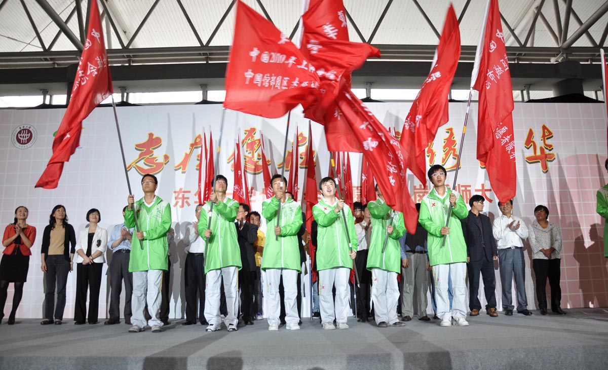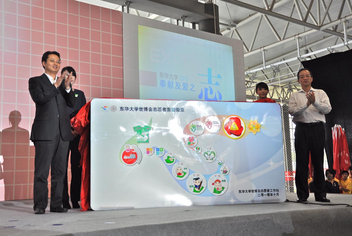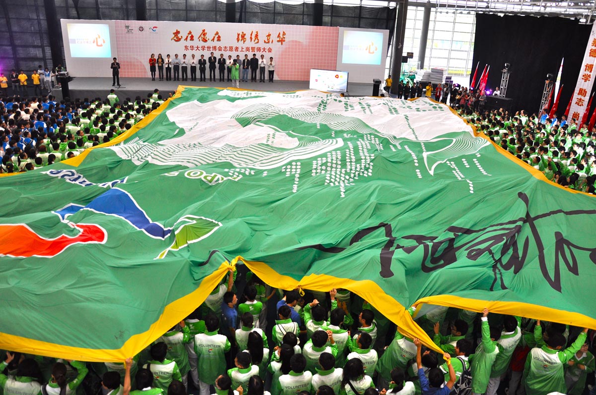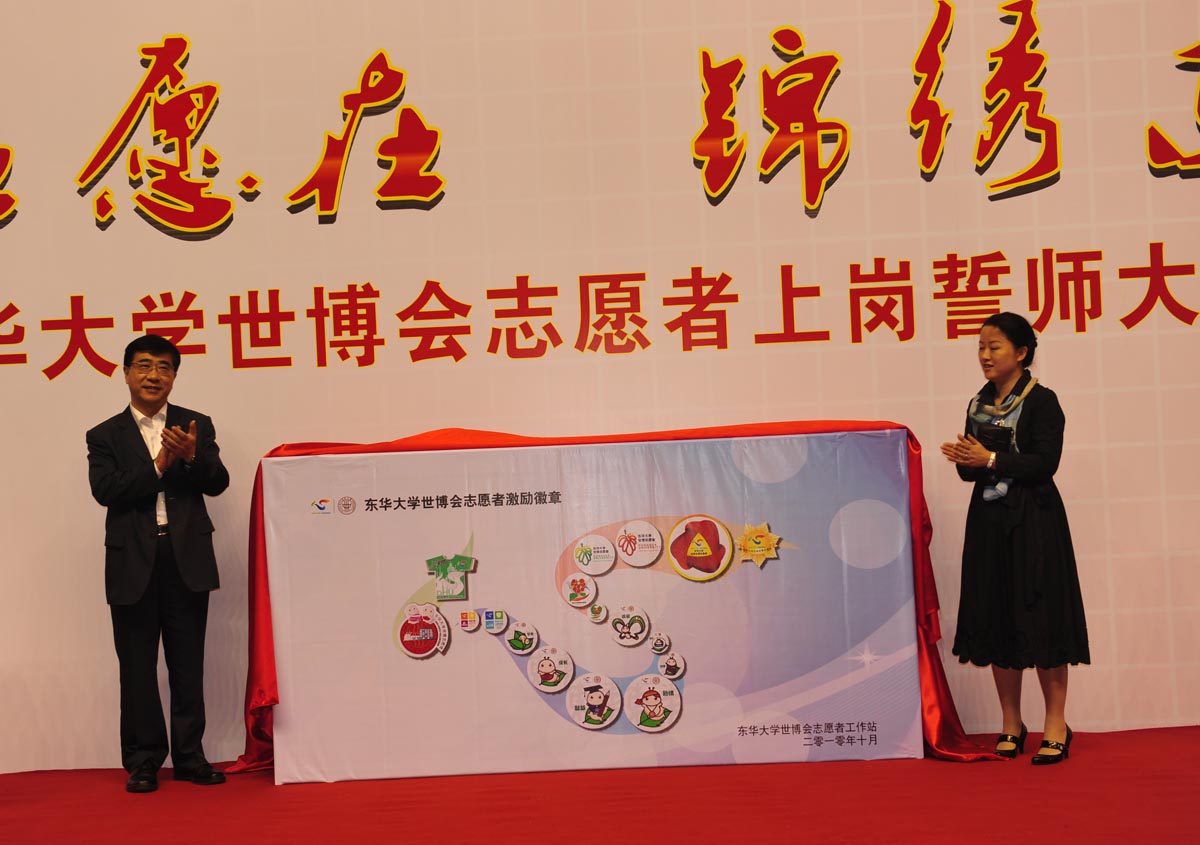 校团委书记徐晶首先通报了我校世博会志愿者工作筹备情况。随后,团市委书记潘敏、校长徐明稚、副校长宋立群、副校长刘春红分别为志愿者徽章墙揭幕。随着终结版校园徽章掀开神秘的面纱,可爱的“蚕宝宝”跳上舞台与大家见面,掀起了会场内的第一波高潮。园区志愿者、城市站点志愿者及后勤保障团队志愿者代表们从与会领导手中接过象征着责任的旗帜。代表们挥舞起手中的旗帜,将东华人的力量和决心传递到每一位志愿者的心中。“用我们的力量 撑起中国向世界展示的舞台;用我们的真诚 让精彩的世博拥有永恒的绚烂”志愿者代表们铿锵有力的宣誓,许下东华全体志愿者对世博会的庄严承诺。伴随着全场志愿者的传递,一件面积约500平方米的园区志愿者服装在会场内缓缓展开,在志愿者们的手手相传中传递过会场,表达出东华大学志愿者们对世博会圆满召开的祝福和期望。