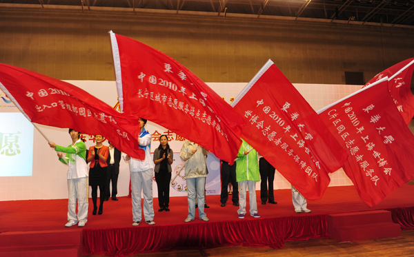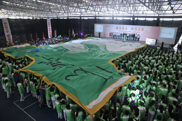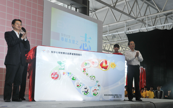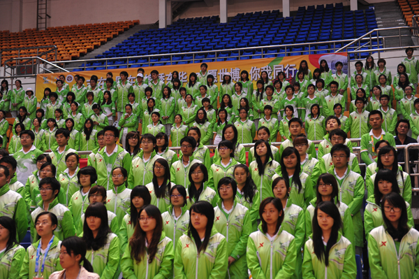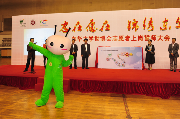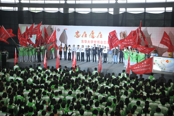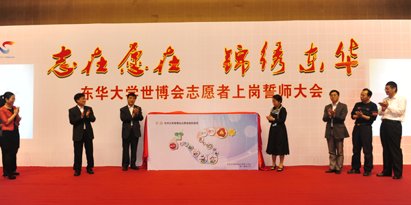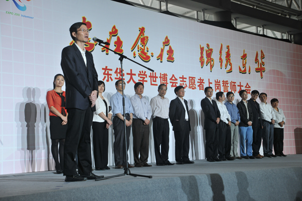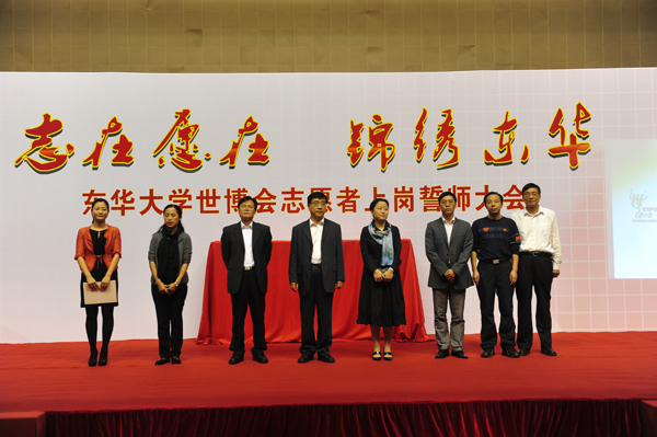 10月12日下午,东华大学世博会志愿者上岗誓师大会在我校隆重举行,我校2400余名园区、城市站点及小水滴志愿者们齐聚东华大学体育馆,用自己的热情和激情向世界庄严宣誓——我们,准备好了。中共上海市委宣传部副部长、市文明办主任马春雷,共青团上海市委书记潘敏,东华大学校长徐明稚,党委副书记浦解明,副校长宋立群、刘春红、邱高,校长助理章国新、朱杏龙及学校相关部处、学院领导出席了誓师大会。