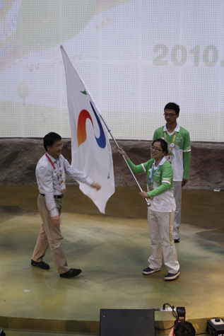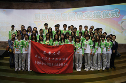 志愿者旗帜交接仪式把整场活动推向了高潮,东华大学、上海交大医学院、上海医药高等专科学校的志愿者代表从上海世博会园区志愿者部部长、团市委副书记夏科家手中结过了旗帜,完成了交接。