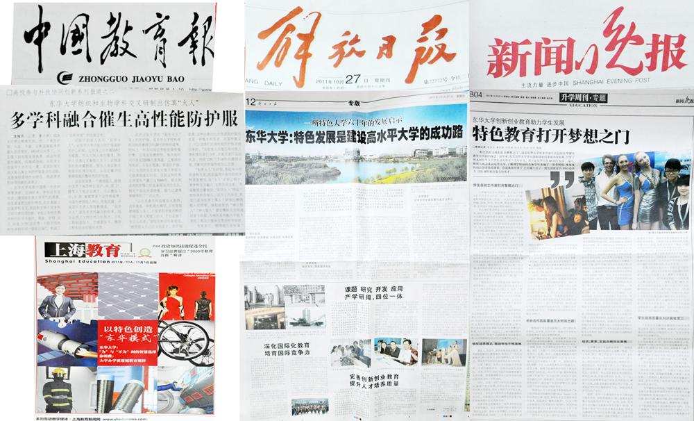 图1-2『深度报道』:中国教育报头版、解放日报专版、新闻晚报专版、上海教育杂志专版、上海教育手机报新闻聚焦、中国服饰报专版等以“东华大学:特色办学是高水平大学建设的成功路”“东华大学:‘为’与‘不为’间的智慧选择”“东华大学产学研用结合 协同创新促学生成长”“东华大学创新创业教育助力学生发展特色教育打开梦想之门”“东华60年 特色为先”等为题,专题报道学校特色办学启示。