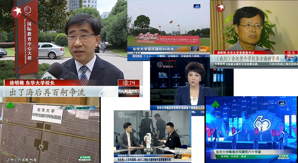 图8『电视媒体聚焦』:东方卫视、上海电视台、上海教育电视台、东方明珠移动电视等专题报道学校60年校庆活动、协同创新成果、特色办学成果。