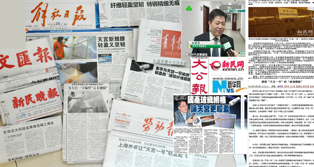 图5『协同创新专题』:以天宫一号电池网格项目、高性能纤维项目等为新闻点,解放日报头版、香港大公报中国新闻头条、文汇报、新华社、上海教育电视台等竞相报道学校产学研用结合成果。