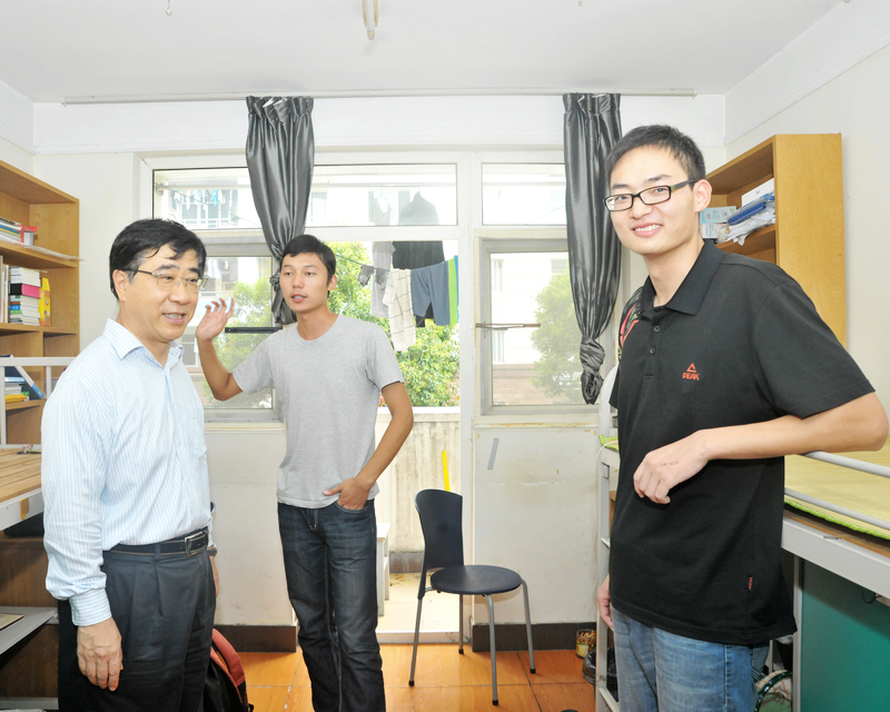 图片二:徐明稚校长来到学生宿舍,与学生亲切交谈