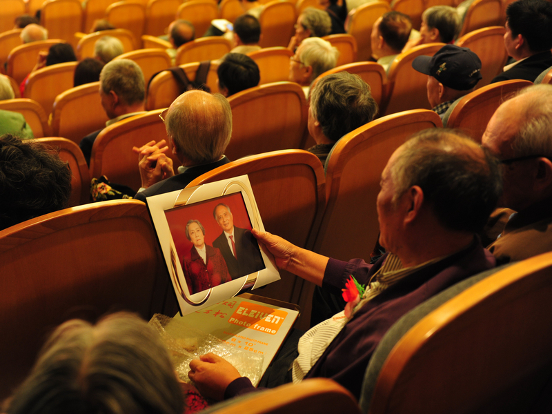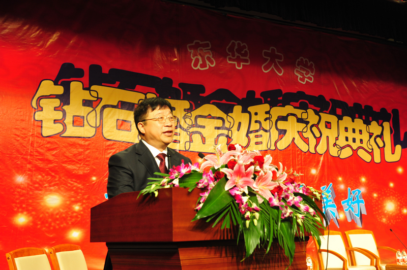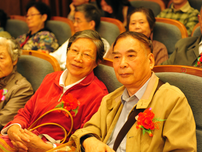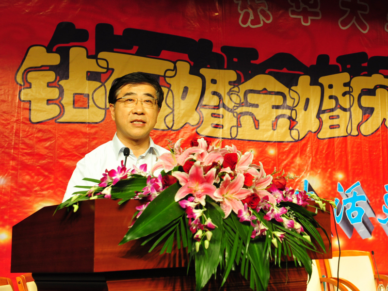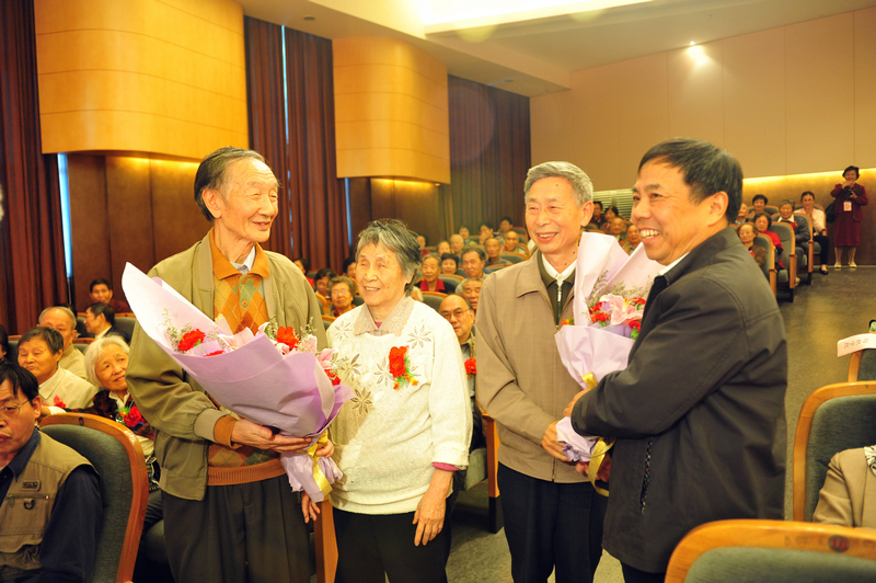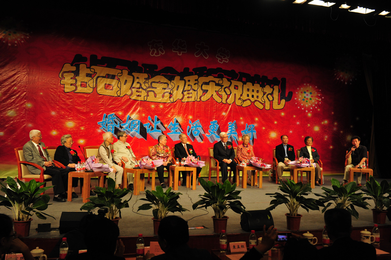 图一:校党委书记朱绍中在大会上致贺辞。 图二:校长徐明稚在大会上致贺辞。 图三:五对钻石婚、金婚的老人接受访谈。 图四:倪伟庆老师向他的老师、金婚老人黄润发夫妇献花,黄润发教授向他的老师、钻石婚老人钱云青夫妇献花。 图五、图六:钻石婚、金婚庆典大会会场。