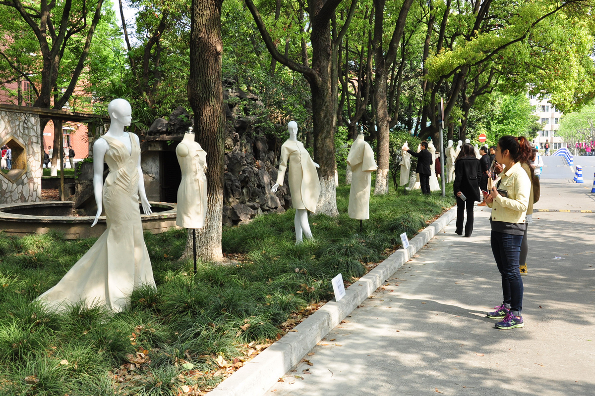 图片四:“纳薇•东华杯”第七届全国大学生服装立体裁剪决赛作品在延安路校区中心花园进行静态展示。
