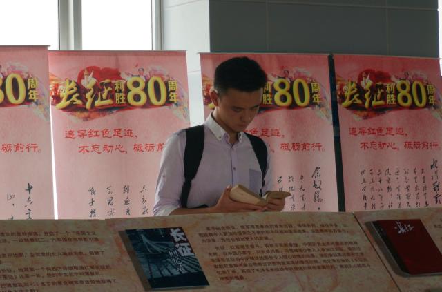 活动中,长征题材的文学作品展真实生动地再现了长征这一人类历史上的伟大壮举,展出书籍题材丰富、主题鲜明。比如《长征》按照时间跨度与地域维度为基本架构,从微观到宏观全景式回顾了长征的历程;《战典》以崭新的视野和独到的见解,揭示我军血脉永续、根基永固的根本所在;《遵义会议精神研究丛书》探讨了遵义会议精神与长征区域文化发展之间的内在关联;《大长征》生动地记述了长征这一人类历史丰碑,以细腻的笔触传承长征形成的革命传统及孕育的宝贵精神;《穿越时空看长征》带你穿越八十多年前的历史时空,领悟红军长征胜利的真谛。本次书展对推荐书目进行了内容推介,吸引了不少同学驻足翻阅,而同步进行的长征知识问答及留言感动等活动,也得到读者们的积极参与和支持。