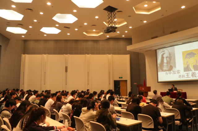 讲座现场,杨建文教授首先提到,王羲之的作品可以分为两个时期,前者为以传统美学5和0.618为特征的古典主义时期;另一个则是以书法和绘画的不同形式推移记录空间立体存在感的超现实时期。他重点展示了能够表现王羲之书法立体主义的书法画作,总结来说,王羲之的书法似奇反正,离奇夸张,为“超现实主义”。通过剖析毕加索的画和王羲之的字,杨教授指出王羲之与毕加索的共同之处在于在三维四维空间中运用二维平面立体表现法。给王羲之和毕加索牵线的人是董其昌,正是他发现了毕加索的画与王羲之的字之间相同的地方,如王羲之对字的移位扭曲处理和毕加索的“立体主义”。杨建文教授认为,写字应该就如同画画一样,要融入自己的感情。他告诉同学们,今年是书法热潮之年,鼓励同学们认真练习书法,用心体会历久弥新的书法作品。