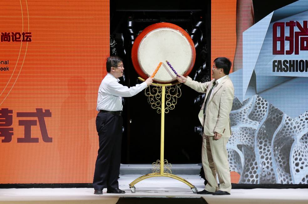 (朱民、顾洪辉一同击鼓,宣布时尚周圆满闭幕)