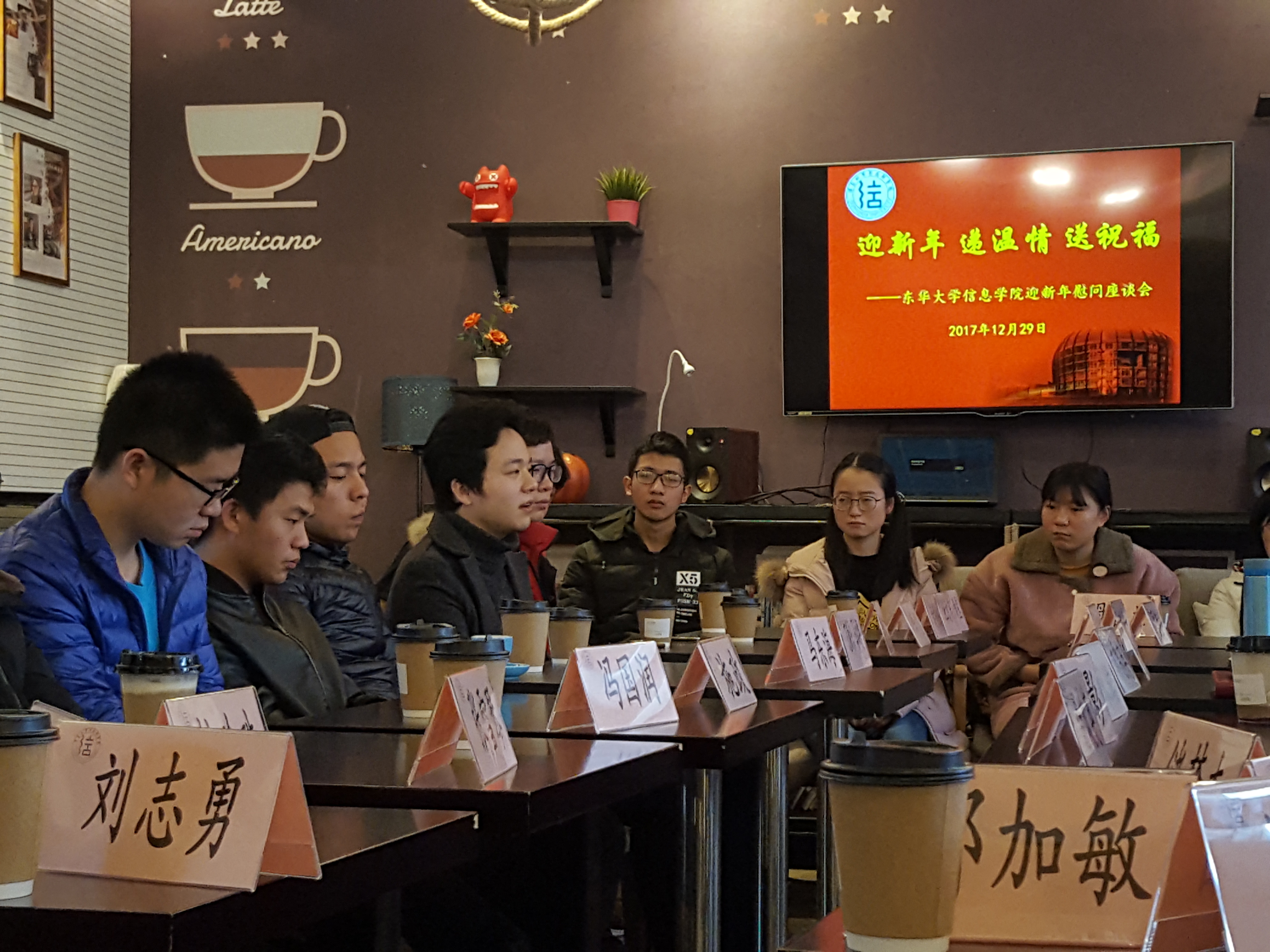 2017年12月29日,信息学院“迎新年·递温情·送祝福”慰问座谈会在松江校区小世界书吧举行。学生处副处长、理学院党委副书记宋珺,学生处副处长、信息学院党委副书记林惠英,信息学院辅导员代表及20名受资助学生代表参加座谈会。座谈会由信息学院资助育人工作主管王秋莲主持。