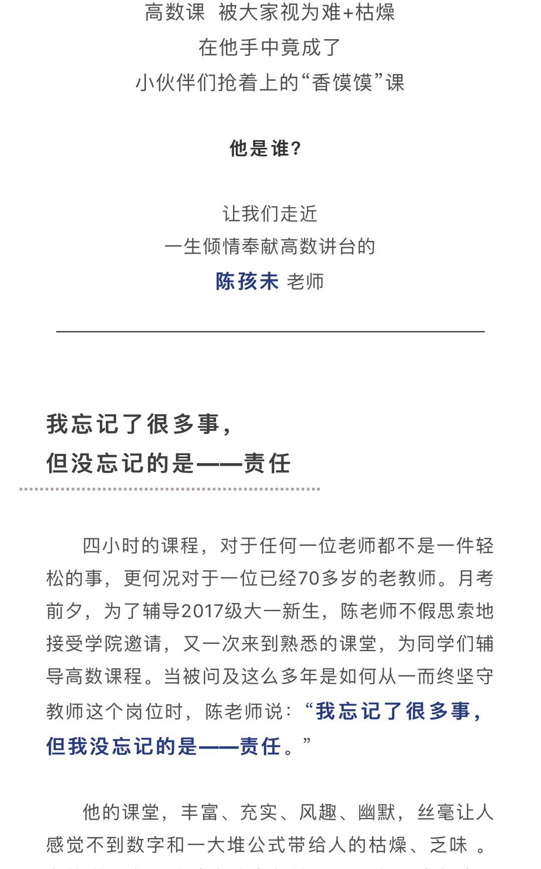 高数课,被大家视为难+枯燥,在他手中竟成了小伙伴们抢着上的“香馍馍”课。他是谁?让我们走近一生倾情奉献高数讲台的陈孩未老师。