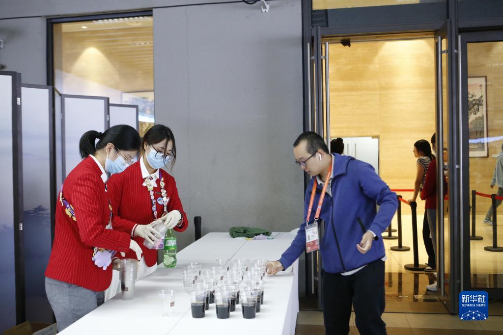 11月7日,上海杉达学院志愿者在新闻中心餐厅提供餐饮服务。