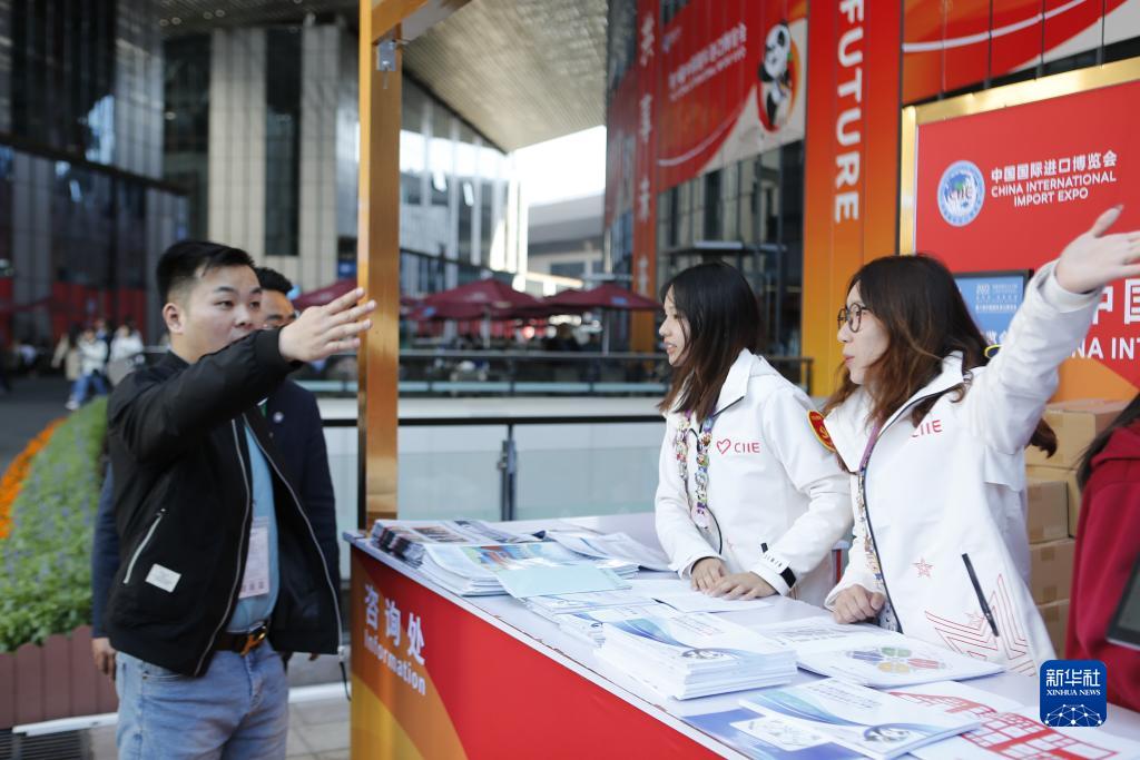 11月7日,在国家会展中心(上海),志愿者为参观者指路。