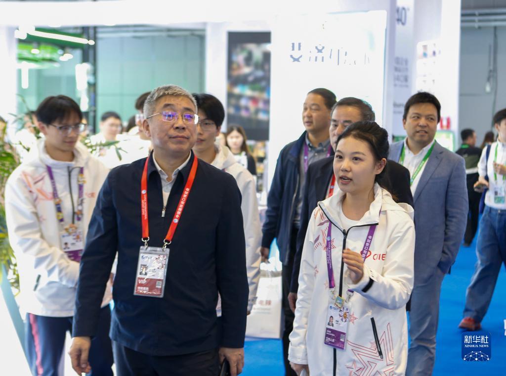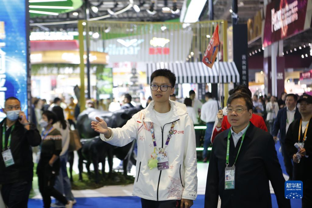 11月7日,在第六届进博会上,上海理工大学志愿者潘奕帆引导观展团参观展区。