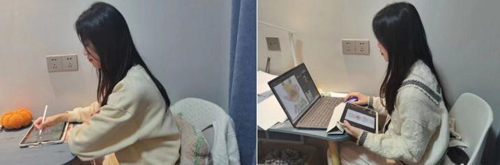 宇萱、宇菁的成长是“你中有我,我中有你”。两人在东华校园中又过上了从前同吃同住同学习的熟悉生活,彼此作伴,还是从前的配方、从前的“味道”,全身心投入专业课程学习中。“我们在学习中会互相帮助,一起观看针织、刺绣和印染的一些教程,并在实践中互相指导,解决创作过程中遇到的难点,也会在繁重的学业压力之下互相鼓励!”姐妹俩这样说道。
