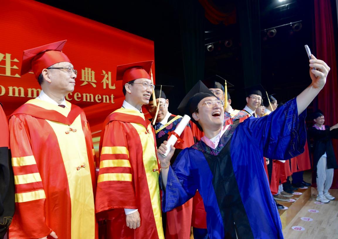 同样提到数字时代的颠覆性变化与不确定性,上海财经大学校长刘元春给同学们提出了三个应对之道,一是“厚德”,勇担新时代新征程所赋予的使命责任;二是“博学”,做有强大学习力和行动力的时代先锋;三是“经济匡时”,把握新规律、新理念、新格局。