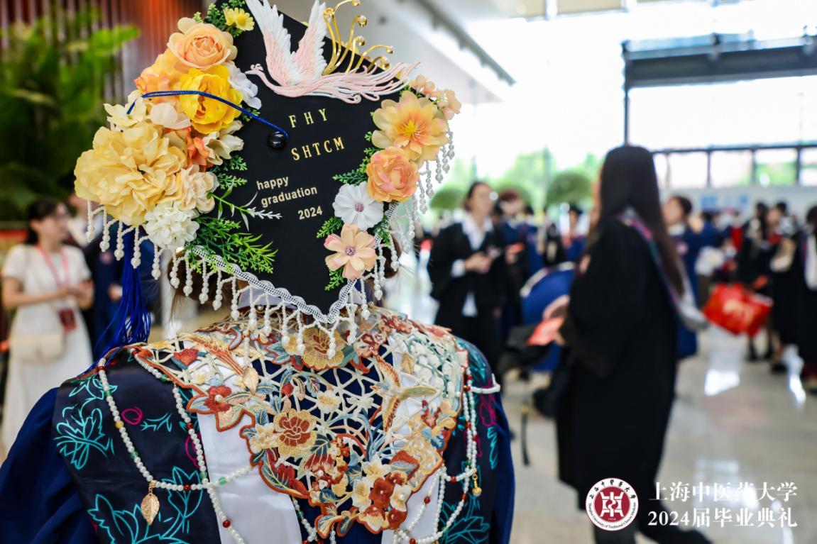 上海中医药大学一名毕业生精心装饰自己的毕业服、学士帽。