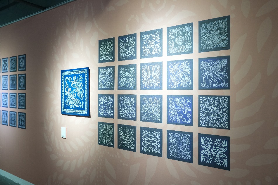 展览分为“记忆、技艺、传统、创新”四个部分内容,将蓝印花布传统的清雅魅力和现代的无限活力呈现在观众眼前。 “长命富贵”“状元及第”“龙凤呈祥”“松鹤延年”,一个又一个朴素又美好的愿景在一件件蓝印花布展品上绽放。