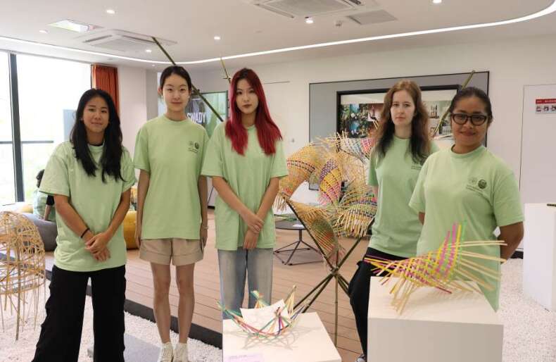 中外学生组成小队共同创作竹编作品。东华大学供图。