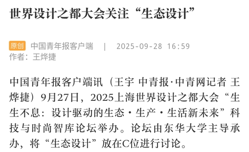中国青年报客户端讯(王宇 中青报·中青网记者 王烨捷)9月27日,2025上海世界设计之都大会“生生不息:设计驱动的生态・生产・生活新未来”科技与时尚智库论坛举办。论坛由东华大学主导承办,将“生态设计”放在C位进行讨论。