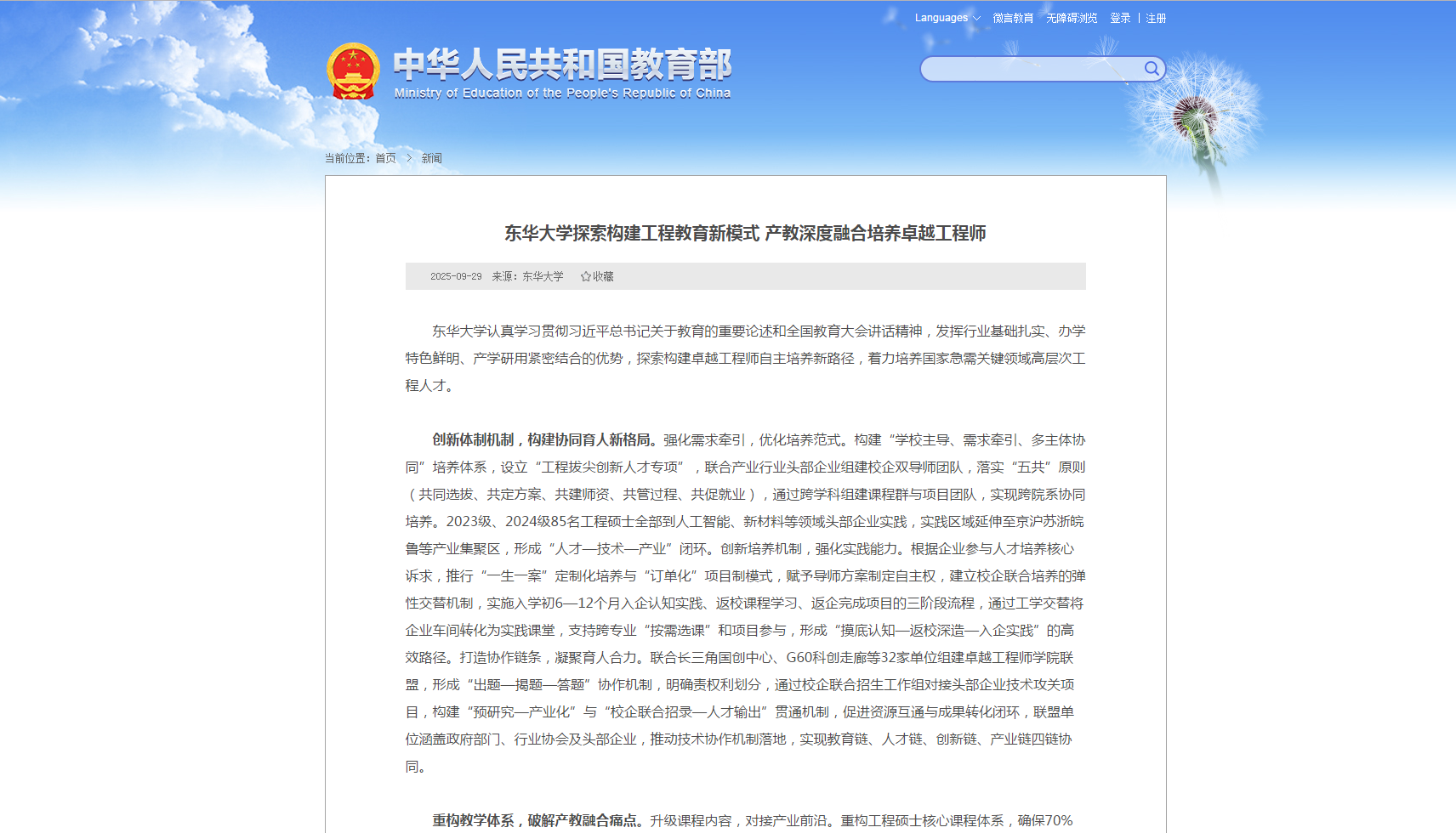 东华大学认真学习贯彻习近平总书记关于教育的重要论述和全国教育大会讲话精神,发挥行业基础扎实、办学特色鲜明、产学研用紧密结合的优势,探索构建卓越工程师自主培养新路径,着力培养国家急需关键领域高层次工程人才。
