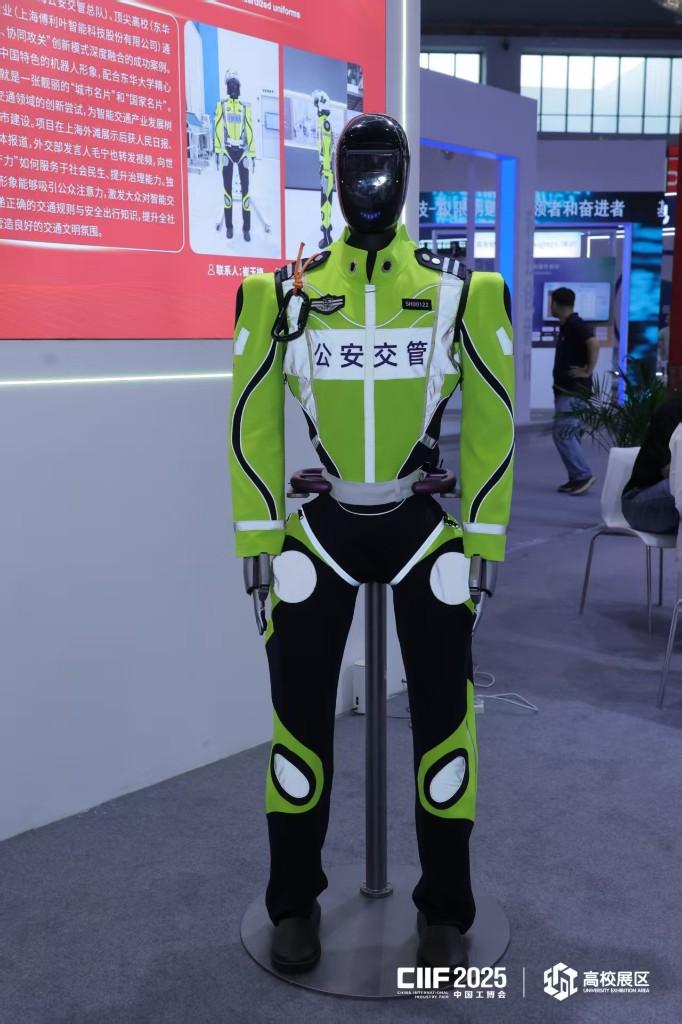东华大学服装与艺术设计学院崔玉梅团队携手上海市公安局交通管理总队联合研发的“公安交管机器人专用制式服装”吸引了现场观众的驻足围观。这款专用服装在研发过程中,对功能性与美观度进行了科学平衡,选用高性能功能性面料,既为机器人提供可靠防护,又通过专业设计提升视觉辨识度,通过鲜明的色彩搭配、符合交通场景需求的款式剪裁,让机器人在车流中指挥交通时更显专业醒目,既强化了交通引导效果,也为城市街头增添了一道充满科技感的风景线。