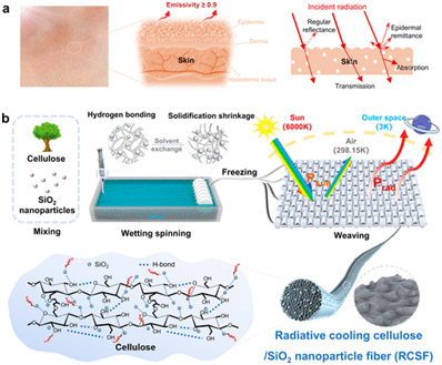 近日,东华大学材料科学与工程学院、先进纤维材料全国重点实验室孔维庆/朱美芳课题组通过从人体皮肤的多层结构与热调节机制中获得灵感,设计了具有仿表皮褶皱结构的纤维素/纳米二氧化硅辐射制冷纤维(RCSF)(图1)。