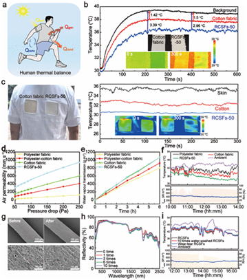 在实际应用中,RCSFs-50织物表现出卓越的综合性能:室内降温效果达3.39°C,较棉织物提升139%;户外使用时表面温度持续低于体表5°C。其透气性为涤纶的9.5倍、棉的1.73倍,透湿性与棉相当。在865 W/m2太阳辐照下,其温度较棉和涤纶分别低5.8°C和9.1°C。经过10次洗涤磨损后,仍保持97.6%的冷却效率,展现出优异的耐久性(图4),为可持续户外冷却纺织品的开发奠定了坚实基础。