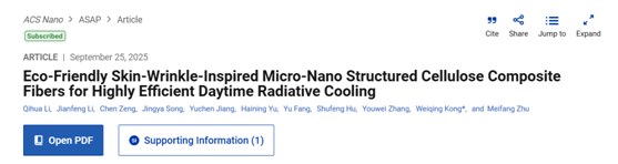 东华大学材料科学与工程学院博士生李绮华为本论文的第一作者,通讯作者为孔维庆副研究员。相关成果近期以“皮肤皱纹启发的微纳米纤维素复合纤维实现高效日间辐射制冷(Eco-Friendly Skin-Wrinkle-Inspired Micro-Nano Structured CelluloseComposite Fibers for Highly Efficient Daytime Radiative Cooling)”为题发表在《ACS Nano》上。该工作得到了上海东方英才(青年项目)等资助。