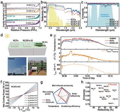 通过对RCSF的光学性能和户外性能测试(图3),该纤维表现出优异的辐射制冷性能,能实现高反射率(93.7%)与高红外发射率(0.98)的协同,同时在户外 800W/m2太阳辐射下实现100.1W/m2净制冷功率,较再生纤维素纤维降温5 °C。