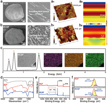 该纤维表面呈现出独特的仿皮肤褶皱突起(高度≈2.0 μm),其微纳米分级粗糙度是原始纤维的四倍。这种协同结构不仅显著提升了太阳光的散射效率,更因其增大的比表面积和形成的空腔结构,有效优化了纤维在人体红外波段(中红外)的吸收与发射率,从而增强了辐射制冷性能。研究表明,纳米二氧化硅通过氢键与纤维素基质牢固结合,构成了稳定的微纳分级结构(图2)。