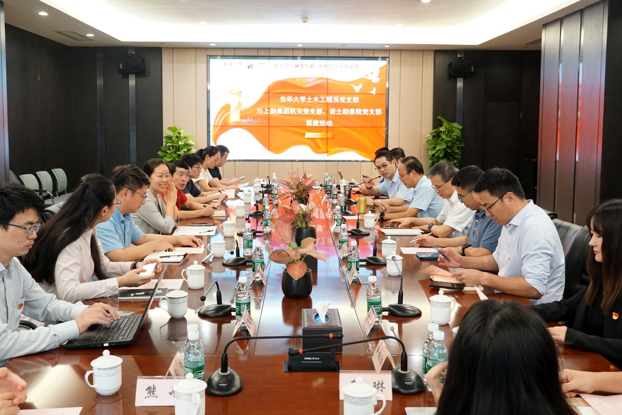 为深入学习贯彻习近平新时代中国特色社会主义思想,进一步加强基层党组织建设,推动党建与业务深度融合,促进高校科研资源与企业实践需求精准对接,2025年10月15日,环境学院土木系党支部与上海勘察设计研究院(集团)股份有限公司(简称:上勘集团)机关党支部、岩土勘察院党支部在上勘大厦联合开展“校企同心融智创新,学研结合共筑蓝图”党建联建活动。环境学院党委书记刘建树、土木系主任杨爱武、土木系支部书记刘笑天,上勘集团董事长/党委书记/总裁武浩、副总裁/总工程师杨石飞、机关党支部书记俞晶、岩土勘察院党支部书记曹兴国,以及三方党支部党员代表参加活动。