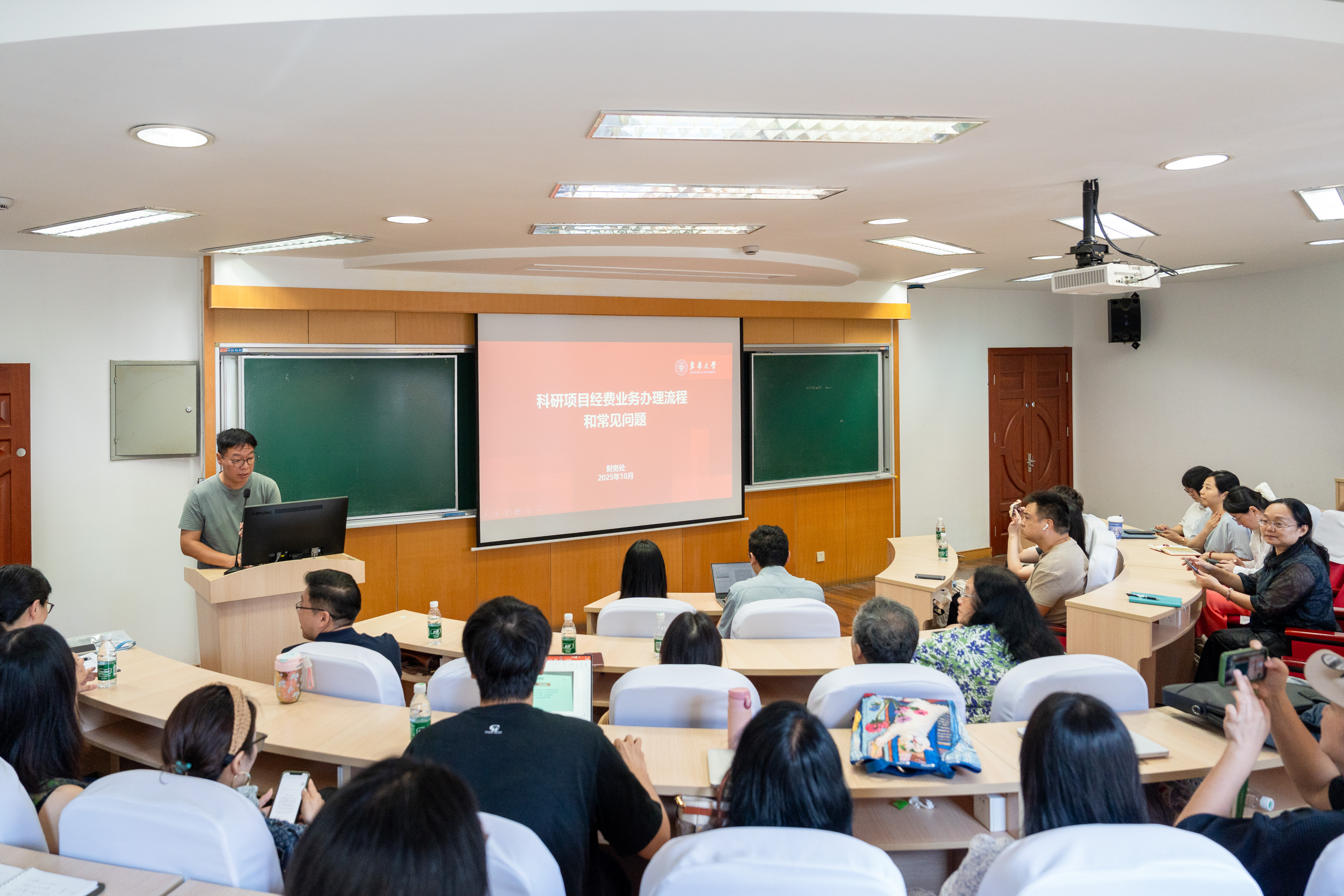 10月14日至15日,科研院牵头联合财务处、纪委办公室等部门,在松江、延安路两校区同步开展科研专题培训。各职能部门组建“送课团队”深入二级单位,通过针对性政策解读、报销实务指导与警示教育,联动校院两级形成宣传教育合力,切实解决科研人员在项目管理与经费使用中的实际困惑。培训中,财务处以科研人员需求为导向,系统梳理科研经费业务办理全流程,重点剖析常见问题,围绕经费使用规范与财务报销流程展开条理清晰的讲解,让科研人员对“钱怎么用、账怎么报”有了更明确的认知。科研院军工科技处结合我校教师参与军工项目的丰富实践,采用“案例拆解+策略分享”的生动形式,深入解读军工项目保密管理要求与申报技巧,精准回应了相关科研人员的关切点。针对科技成果转化与人文社科项目的不同特点,培训还设置了专项讲解环节:科研院产学研合作处从政策框架、流程优化、风险防控三个维度,全面解读科技成果转化核心要点,为科研成果落地提供可操作的路径指引;人文社科处则聚焦人文社科项目特殊性,系统阐释项目管理规范与经费使用细则,特别强调项目申请书编制、过程合规把控及绩效评价设定的关键环节,为人文社科研究的高效开展保驾护航。此外,纪委办公室多位同志也通过送课上门,以“身边案例”为警示素材,与新进教师群体、部分二级单位党委中心组(扩大)成员深入交流日常监督执纪中发现的科研经费领域存在的问题和隐患。培训交流活动中,聚焦教师实际需求,突出问题导向,通过“政策讲解+案例演示”模式,让枯燥制度鲜活起来,有效破解了教师在经费使用中的疑难问题,切实让制度红线从“纸面”走向“实践”。