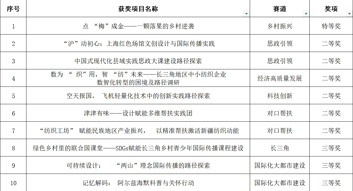 学校有6个项目获得二等奖。其中,服装与艺术设计学院“‘沪’动初心:上海红色文化资源国际传播设计实践”项目,推动红色文化年轻化、国际化表达;马克思主义学院、校团委“中国式现代化县域实践思政大课建设路径探索”项目,构建“理论萃取—实践转化—价值传导”的县域思政育人新范式;旭日工商管理学院“数为‘织’用,智‘纺’未来——长三角地区中小纺织企业数智化转型的困境及路径调研”项目,助力中小纺织企业数智化转型;机械工程学院“空天报国,飞机轻量化技术中的创新实践路径探索”项目,融合国情教育、专业实践与价值引领;机械工程学院“津津有味,设计赋能多维帮扶实践团”项目,以设计赋能盐津经济社会发展;纺织学院“‘纺织工坊’赋能民族地区产业振兴:以精准帮扶激活新疆纺织动能”项目,助推新疆纺织业绿色智能化转型。