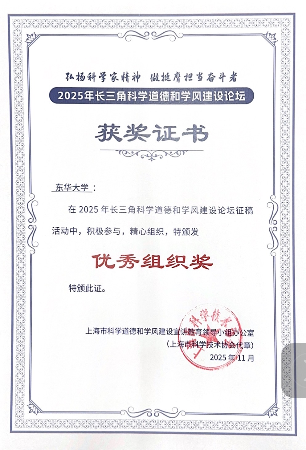 近日,在上海市科协、上海市教委指导,上海市科学道德和学风建设宣讲教育领导小组办公室、上海市学位委员会办公室共同举办的“弘扬科学家精神,做挺膺担当奋斗者”长三角科学道德和学风建设论坛上,我校报送的多件作品获奖。其中,创新实践之星1人,一等奖1项,二等奖3项,三等奖6项,优秀奖9项。我校继续获得优秀组织奖。