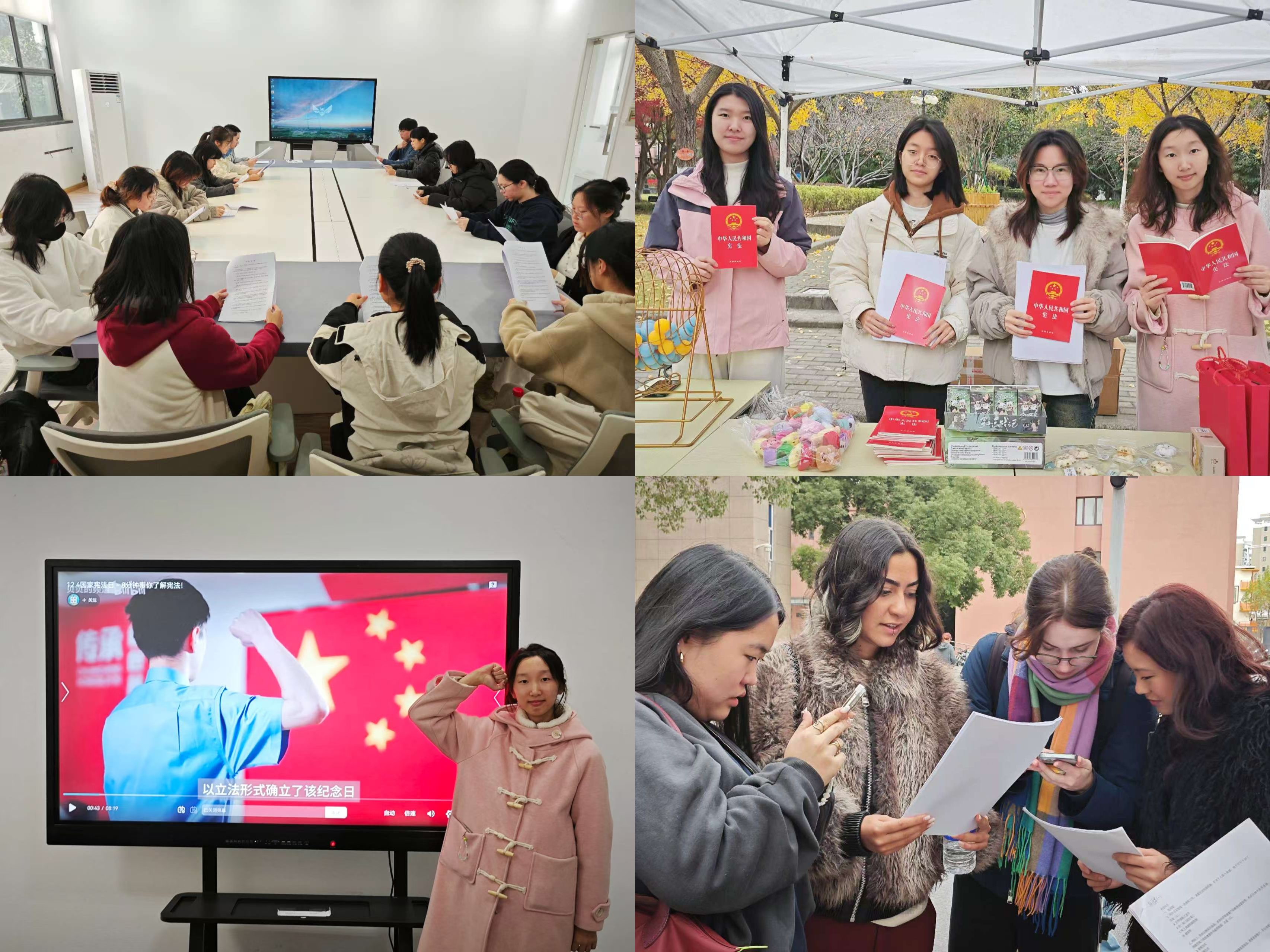 在宪法宣传周,人文学院在延安路校区举办了“宪光晨启,法韵书声”主题宪法晨读活动、“铭宪于魂,履宪于行”主题宪法宣讲活动、“学宪知规明事理,守宪尽责担使命”主题宪法普法活动,通过集体晨读、宪法宣讲、普法咨询等,让大学生们直观感受宪法作为国家根本大法的庄严与权威,感悟宪法与日常学习生活密切相关,促进了宪法精神传播。