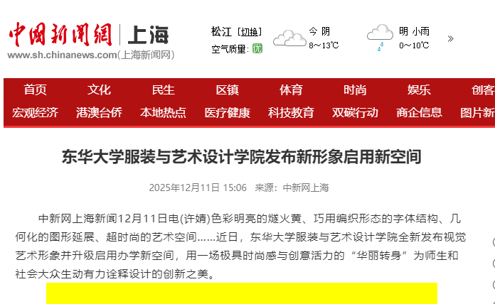 中新网12月11日电(许婧)色彩明亮的燧火黄、巧用编织形态的字体结构、几何化的图形延展、超时尚的艺术空间……近日,东华大学服装与艺术设计学院全新发布视觉艺术形象并升级启用办学新空间,用一场极具时尚感与创意活力的“华丽转身”为师生和社会大众生动有力诠释设计的创新之美。
