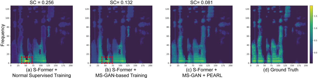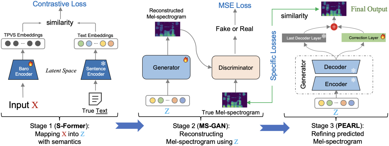 为此,如图5所示,本研究提出一个三阶段梅尔谱图重建管道,将语义理解与梅尔谱图生成解耦。首先,名为S-Former的语义编码器将句子的完整TPVS映射到与其文本嵌入共享的潜在语义空间,避免了对齐需求。其次,利用学习到的潜向量通过生成式网络MS-GAN逐步生成粗粒度梅尔语谱图。最后,通过自适应残差学习实现的音素增强(PEARL)对其进行精细化,从而在无声学监督的情况下实现梅尔语谱图的高保真重建。
