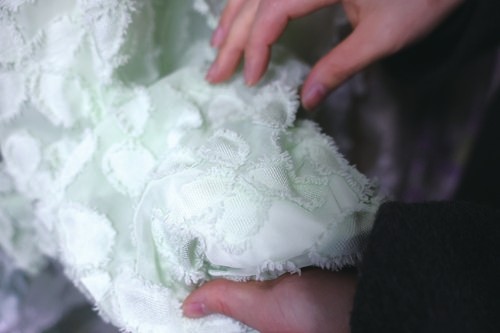 这种“适应性”贯穿于她们的许多设计作品中。比如,一条款式蓬松可爱的绿裙子,设计了蕾丝花边、小蝴蝶结,远看充满了现代少女感;走近细看,原来面料用的是传统织锦,纹样是中式花纹,工艺则是经典的暗纹。这些传统中式元素没有浮于表面,而是沉到了内里,在悄无声息中完成了“中西融合”。