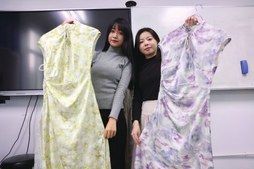 韩奕雯(左)和姚秦展示改良设计后的旗袍。