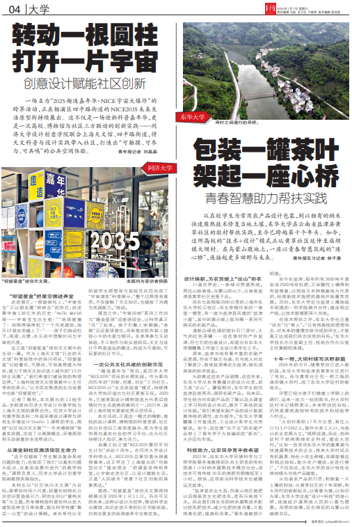 从包装农产品的巧思,到修复一片土壤的科技;从黄草社区的十年深耕,到大坝村的崭新起点,以青春为墩,以知识为梁,东华大学这座“设计+科技”的连心桥,连接起沪滇两地人民的心意与愿景。而桥的故事,还在绵延的乌蒙山间继续书写。(来源:青年报 作者:林千惠 时间:2026年01月07日)