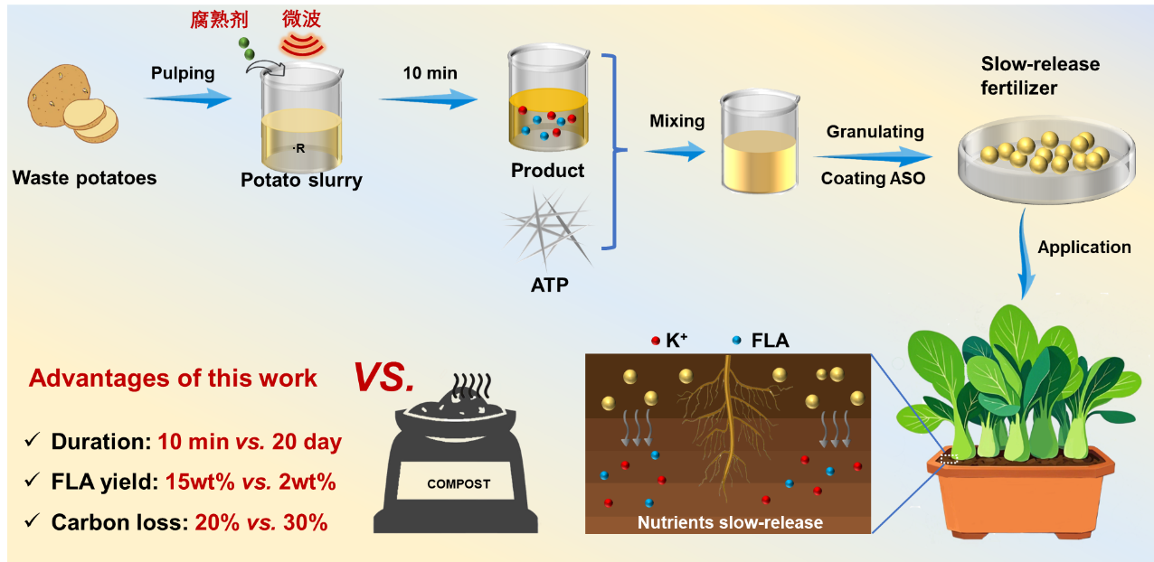 研究团队在原创的有机固废1小时腐熟技术(一代技术)基础上,研发出微波强化餐厨垃圾分钟级腐熟技术,其关键在于:利用微波强化促产自由基,诱导餐厨垃圾中的多糖、蛋白质等易腐有机物发生降解-聚合反应,在10分钟内转化成高活性类黄腐酸,并将产物可进一步制成黄腐酸钾型纳米缓释肥。重要的是,该工艺较第一代技术可节省腐熟剂用量可节省75%,成本降低50%,效率提高6倍。盆栽和田间试验表明,该肥料可显著促进植物生长和根系发育,同步改良土壤微生态。与传统的餐厨垃圾堆肥相比,该技术兼具成本低、肥效高和碳排低等优势,为餐厨垃圾高效肥料化提供了有效新质生产力。