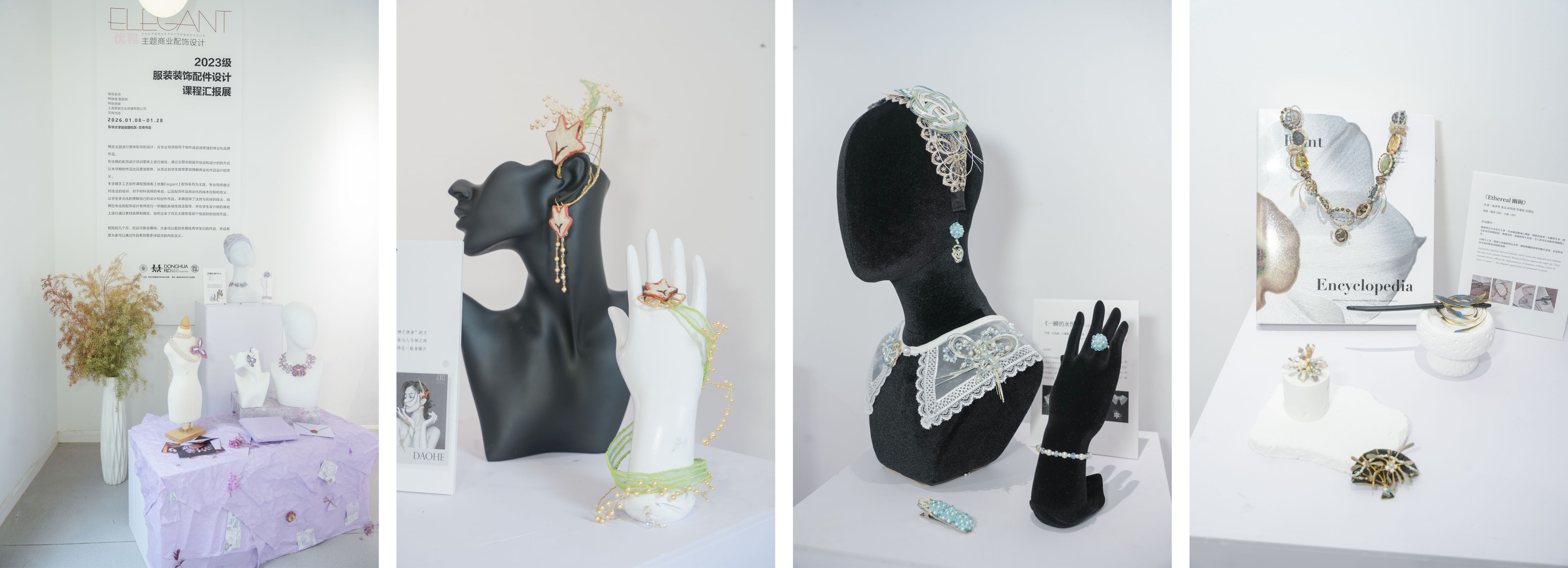 2023级服装装饰配件设计课程作品正在延安路校区文绮书店展出,静态展以“优雅”为线索,作品突破传统配饰边界,融入众多设计创新语言,从智能胸针、模块化包袋到互动首饰,展现配饰与科技、艺术、商业场景的多元融合。